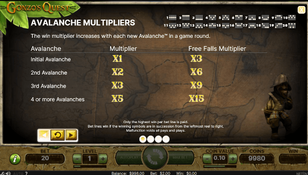La característica más interesante y única de Gonzo’s Quest es la función Avalancha. Los Multiplicadores de Avalancha se activan cada vez que hay una combinación ganadora en los carretes. Los símbolos ganadores serán reemplazados por nuevos símbolos. Esto sigue ocurriendo mientras se creen nuevas combinaciones ganadoras, y también participas en un multiplicador de ganancias.