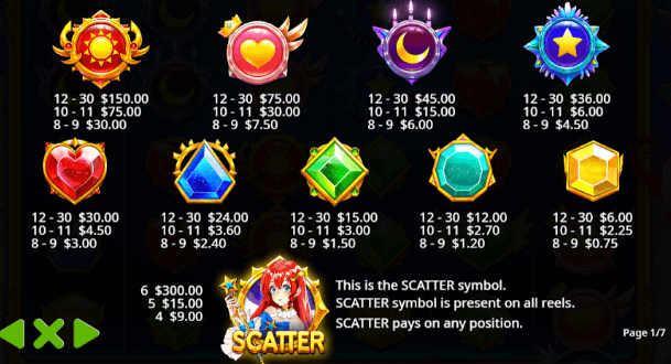 Los símbolos de pago más bajo son las gemas. Estas vienen en colores azul, verde, esmeralda, amarillo y rojo. Los símbolos de pago más alto son los siguientes: